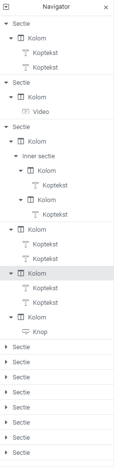 Het meest fijne van de navigator is dat je eenvoudig content heen en weer kunt verplaatsen. Dit werkt via een simpele “drag & drop”. Ga met je muis naar de sectie/kolom/widget die je wilt verplaatsen en sleep hem naar de gewenste plek. Je zult nu direct het resultaat zien.